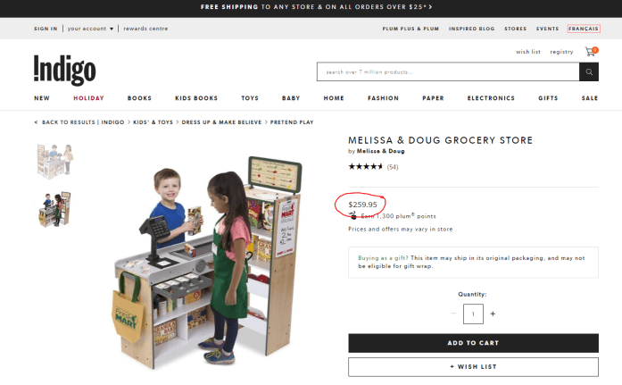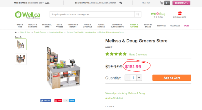 I was shocked when I saw that Well.ca — a site I had NEVER used before, never even heard of, honestly — was selling the identical toy for $181.99. Almost $78 cheaper than Indigo, which is where I often shop for toys.