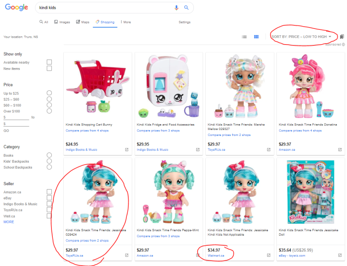 I just tested this by searching “Kindi Kid” (another gift our daughter wants) and sure enough, it shows that the identical doll is $5 cheaper on ToysRUs.ca than it is on Walmart.ca.