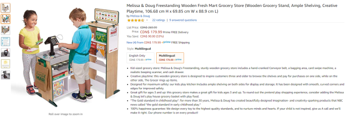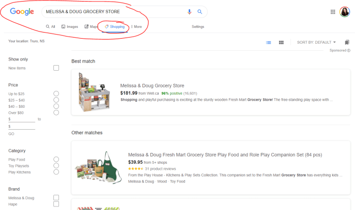 Type in the specific name of the product if possible. In my case, I typed “Melissa & Doug grocery store.”