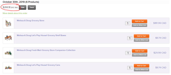 And because Well.ca had ALL of their Melissa & Doug products on sale, I was able to scoop up three additional sets (grocery store accessories, pretend grocery cans, and pretend grocery boxes) all for almost exactly the same price I would have paid JUST FOR THE ONE big item on Indigo.