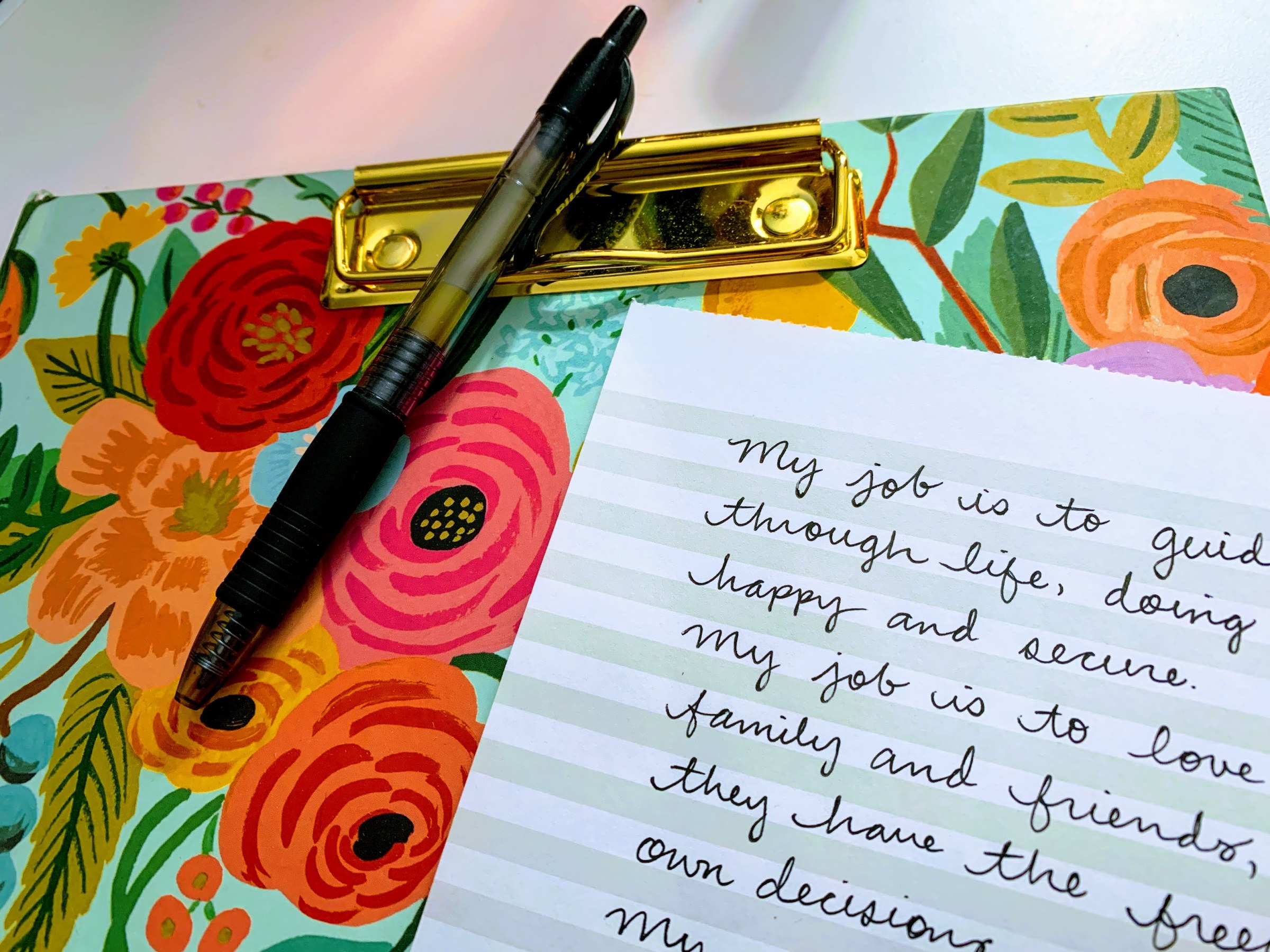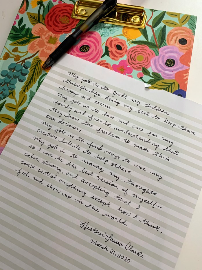 My job is to guide my children through life, doing my best to keep them happy and secure. My job is to love and care for my family and friends, understanding that they have the freedom to make their own decisions. My job is to find ways to use my creative talents to help others. My job is to manage my thoughts so I can be the best version of myself — calm, strong, and accepting that I can’t control anything except how I think, feel, and show up in the world.