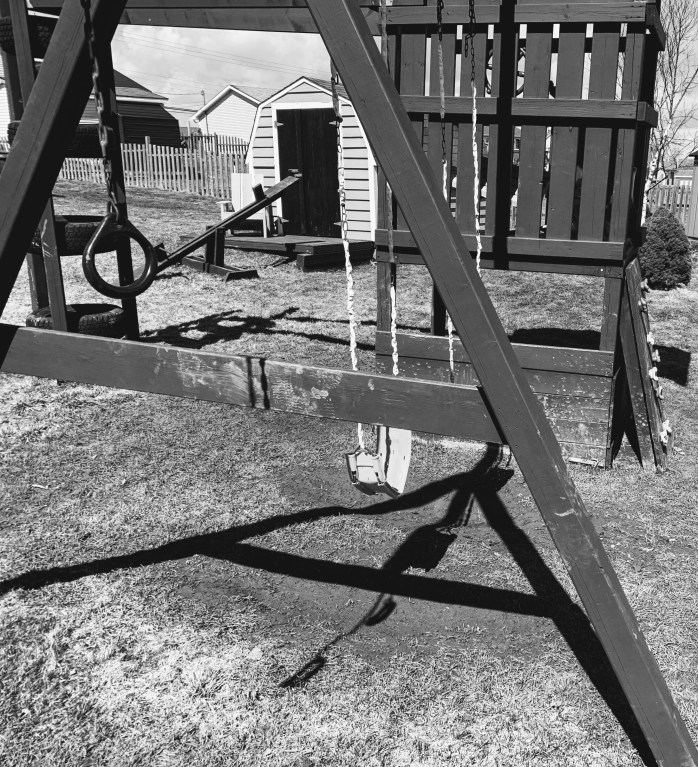 We live on a street with (mostly) very small, shared yards. Our backyard playground is mere feet away from our neighbour’s backyard playground because, as I said, these yards are SMALL AND SHARED.