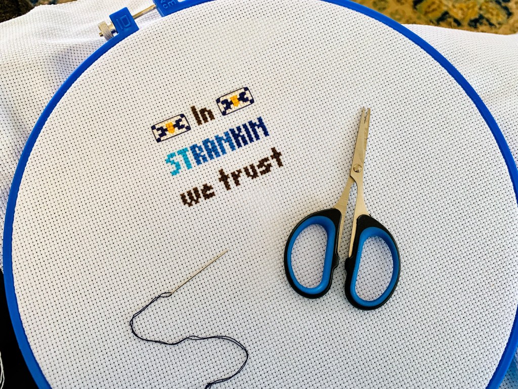 I was doing online Zumba this morning in my home office, looking at a framed cross-stitch I have just behind my monitor, and thinking “Wow, it’s been forever since I cross-stitched anything.”
