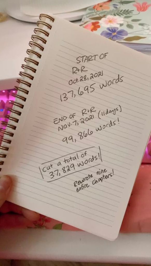 I started a new notebook to log my R&R progress and shared updates each day over on Instagram Stories. Entire chapters were cut! Other chapters were fully rewritten! Tons of work, but I was happy to do it because a real, live agent (in NEW YORK CITY, no less) had suggested the changes.