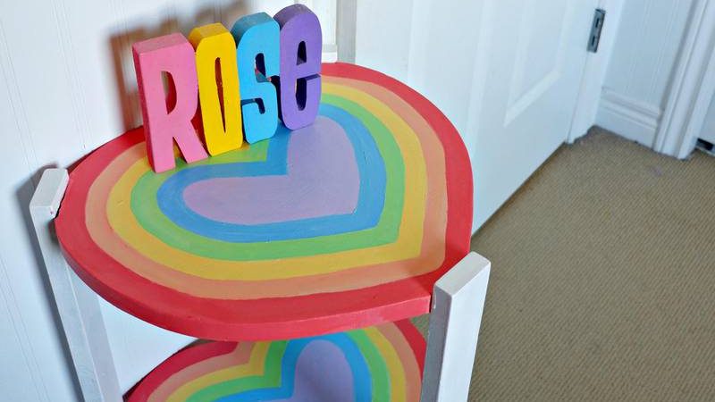 The heart-shaped rainbow table looks so cute in our daughter’s bedroom. Mostly it holds her Alexa (Echo Dot) for her bedroom dance parties, but it’s also housed her painted Clay Cafe creations and her LOL dolls. It’s also served as a very fancy stage for her Barbies to perform on.