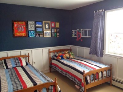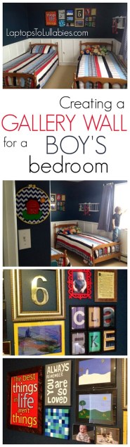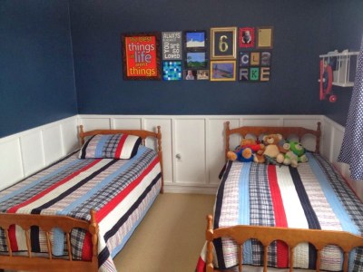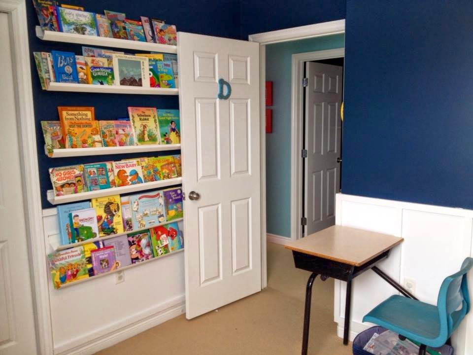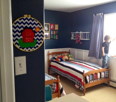 D’s room now has so many elements that I LOVE (board-and-batten, a nice bold paint colour, a gallery wall) along with kid-approved items (a funky old school desk, stickers all over the window) and lots of colour (the red and yellow accents in the gallery wall make me smile).