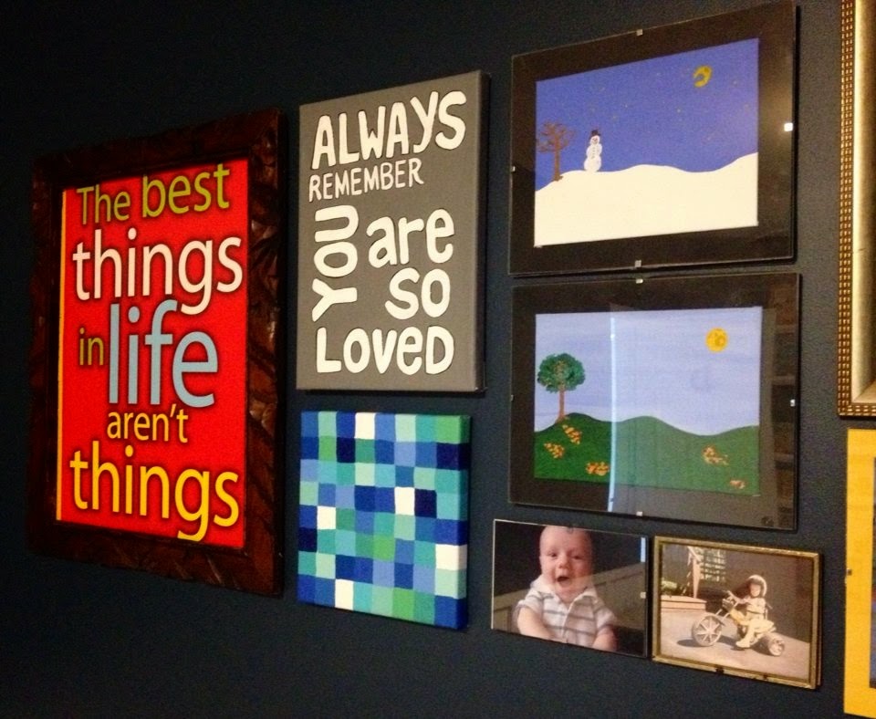 | Red poster is from a school supply shop, grey “Always remember you are so loved” was painted by me, blue square painting by me, two landscapes by me (I got new paints for Christmas, thanks Mommmm). Cute baby D photo is on the left, and a cute Baby Darling Husband photo is on the right. |