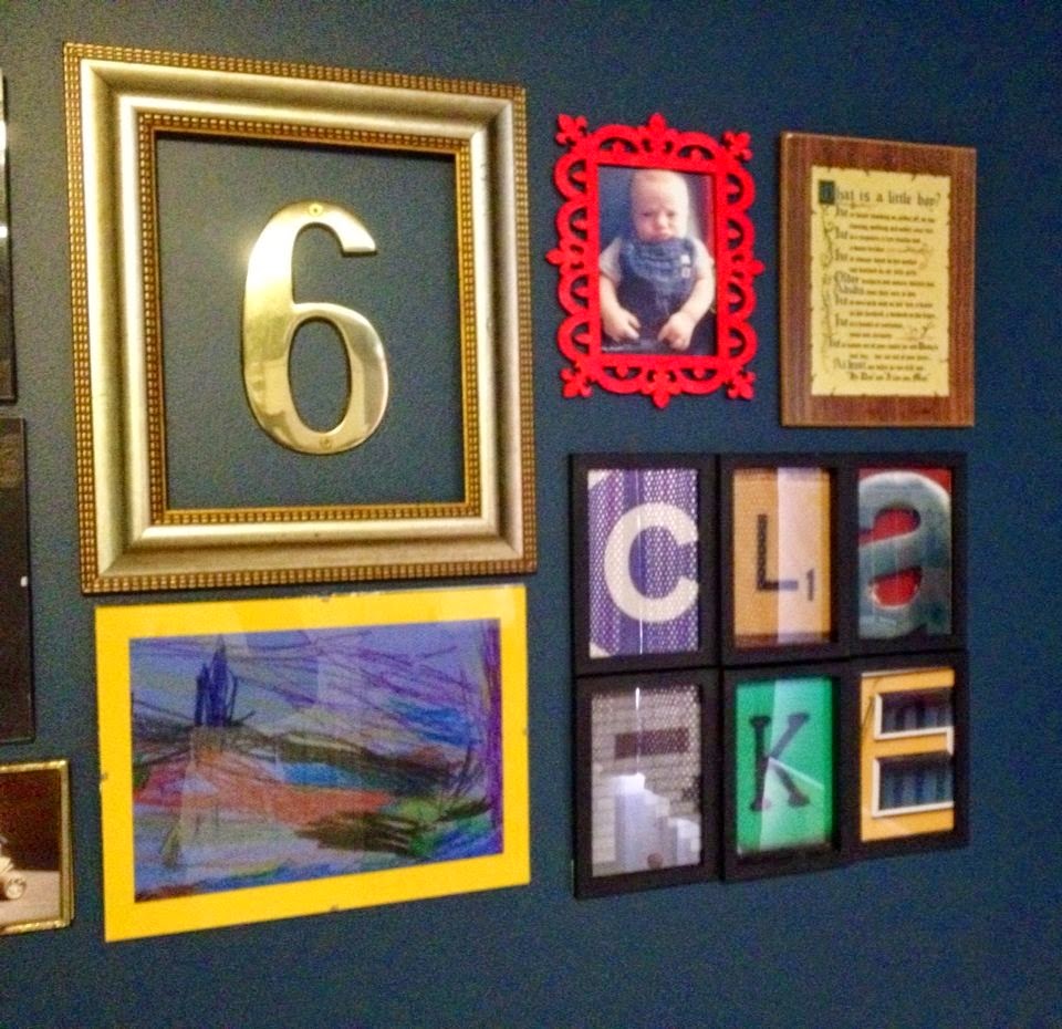 | Little Sis always makes fun of me for putting Cs in all of my gallery walls, but THERE IS NO “C” here. Just a six, because our sweet boy was born on 6/6/10 (it’s a brass house number from Kent). The red frame is a $1 cut-out I bought at Michaels and painted red, the yellow mat around D’s artwork is a piece of yellow cardstock, the “What is a little boy?” plaque is from when Darling Husband was a baby, and the “C-L-A-R-K-E” photos are free printables that I stuck in two three-slot Walmart photo frames and jammed together. |