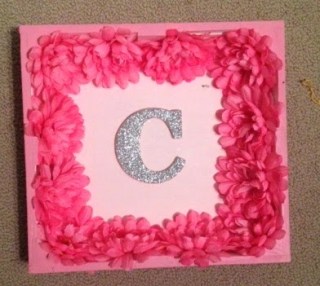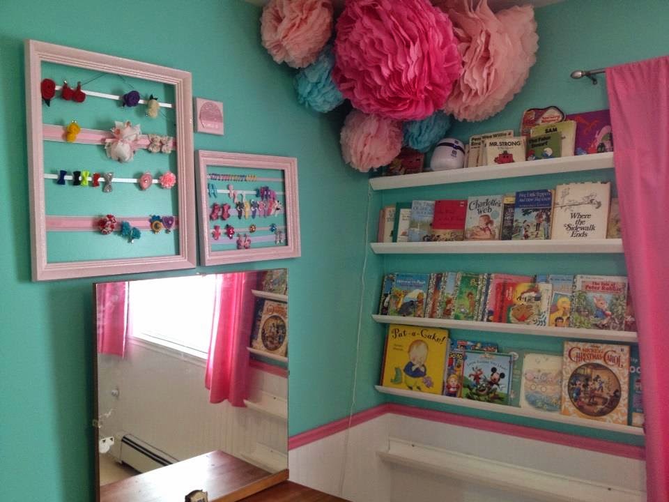 | We’d filled up C’s original hairclip frame (the smaller one) a while back, so I grabbed another reject frame from the basement, painted it the same shade of pink, did a coat of glitter (GLITTERRRR) and glued on a few similar strips of ribbon. Now we have lots of space!