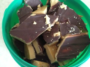 It involves a bit of standing around the stove, and then an hour of your time as you stir it every 15 minutes, but it’s not hard to make. I packaged some of it in bags tied with ribbon, some in these little plastic holiday tubs (bought at the Dollarama), and some in clear plastic candy containers (saved from when I did a candy buffet for Darling Husband’s birthday in November).