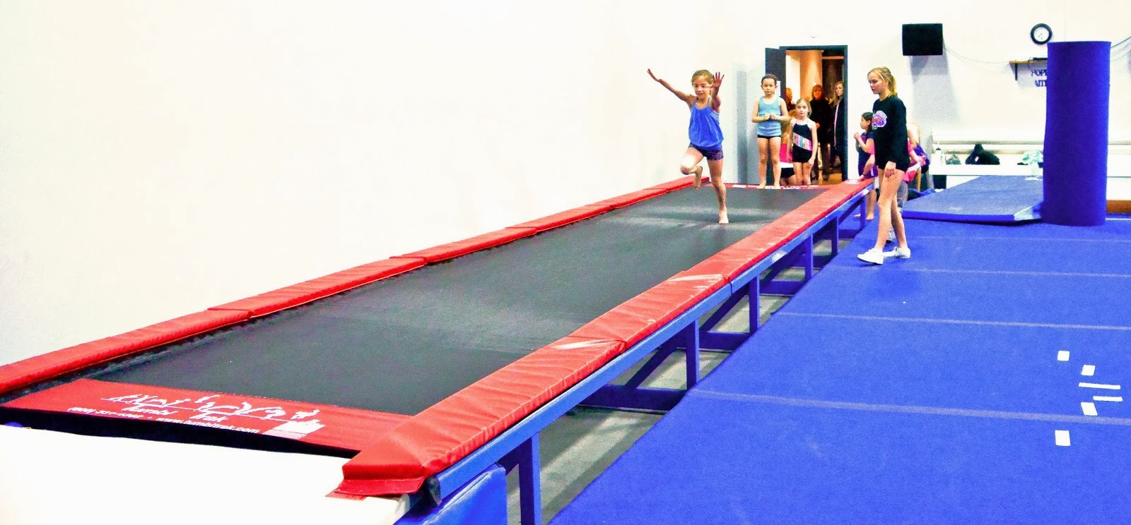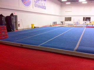 - Tumble Track: This is what the “tumblers” (a.k.a. Young Agile Flippers and Twisters) use for their tricks. I enjoy running down it as fast as I can and then throwing myself onto a mat. Everyone laughs at me, but it’s really fun. Oh, and we also use it for bouncing down in a row (practicing to point our toes), doing donkey-kicks (hideously unflattering crawl-type kicks), and doing tuck jumps. My tuck is a pretty sad attempt, so far, but it’s coming along.