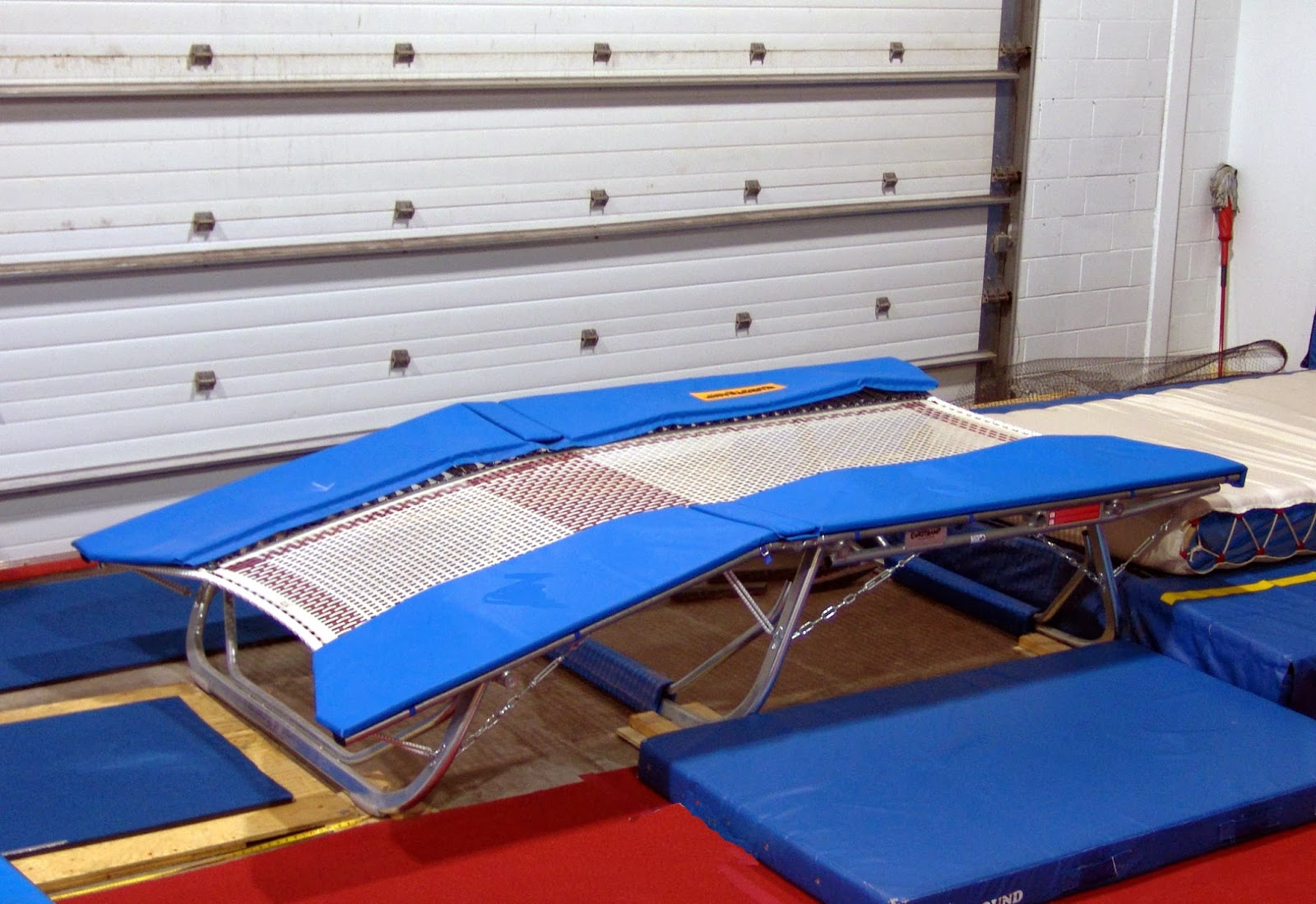 - Double-mini trampoline: This is a great one! It’s very bouncy. We run up to it and do one or two jumps on it, and then do a leap-forward somersault off it, onto the mat.