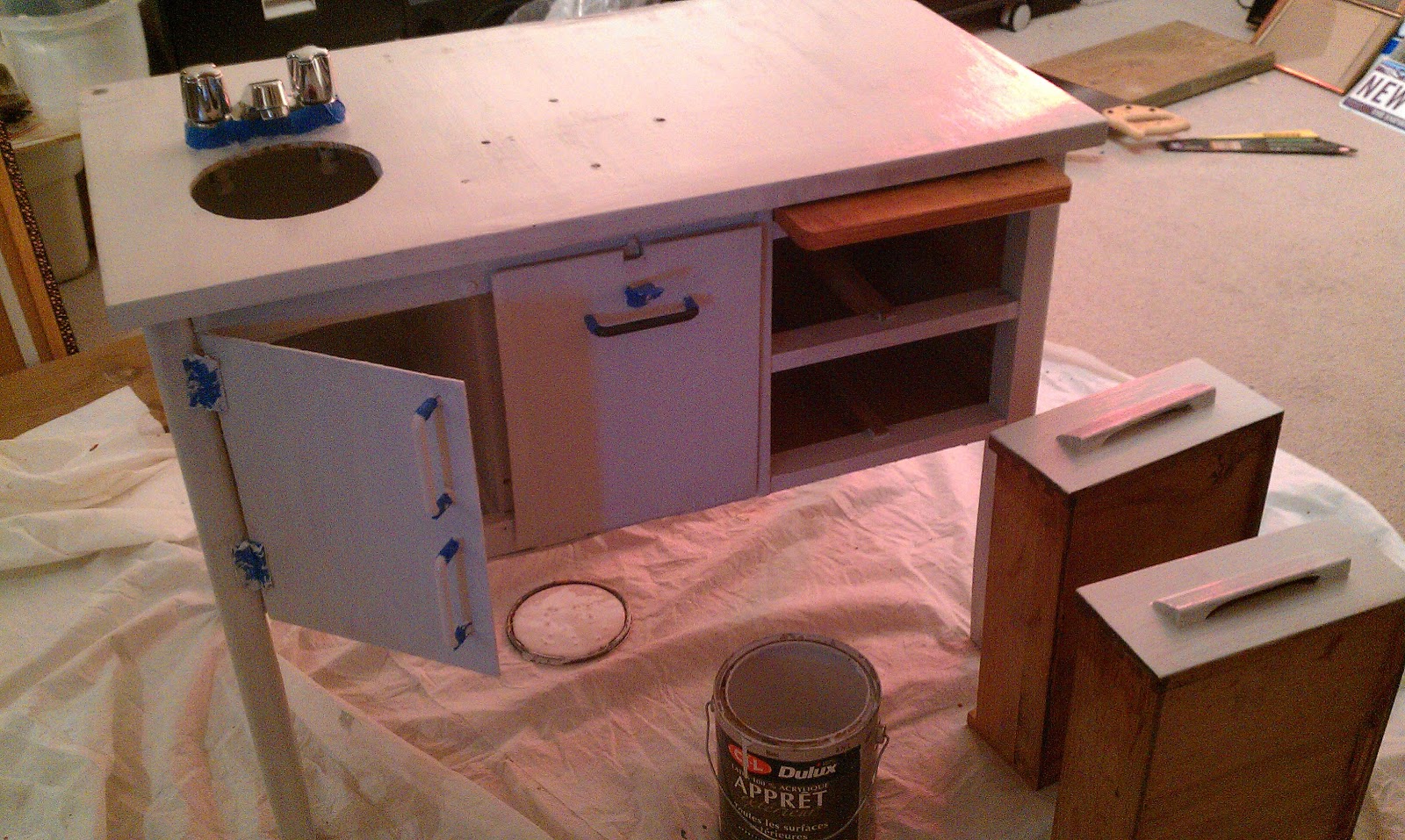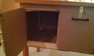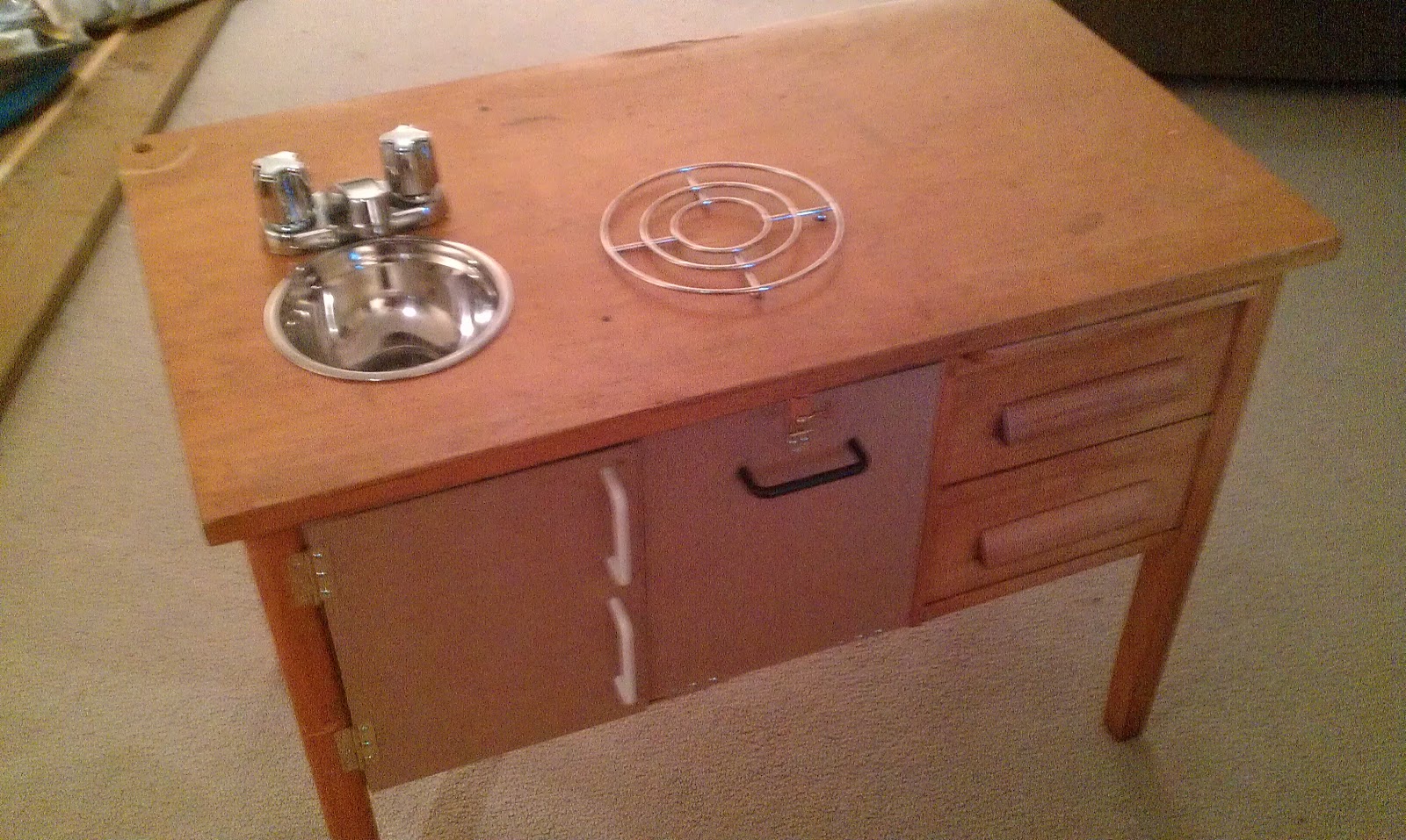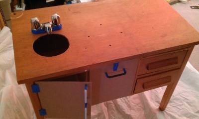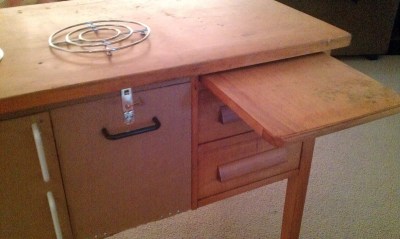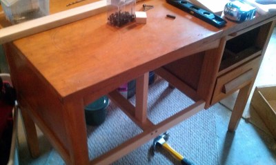 | Forgive me for losing the official “Before” picture (it’s been a while), but here is a shot of Darling Husband adding some framing to the underside of the desk (to make a little fridge and oven) |