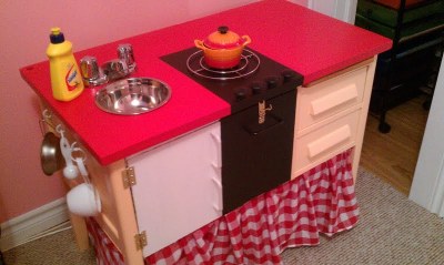 | We added some hooks on the sides (also from the Dollar Store) and I stapled a red gingham skirt along the bottom to hide the plastic storage bins of play food and dishes. |