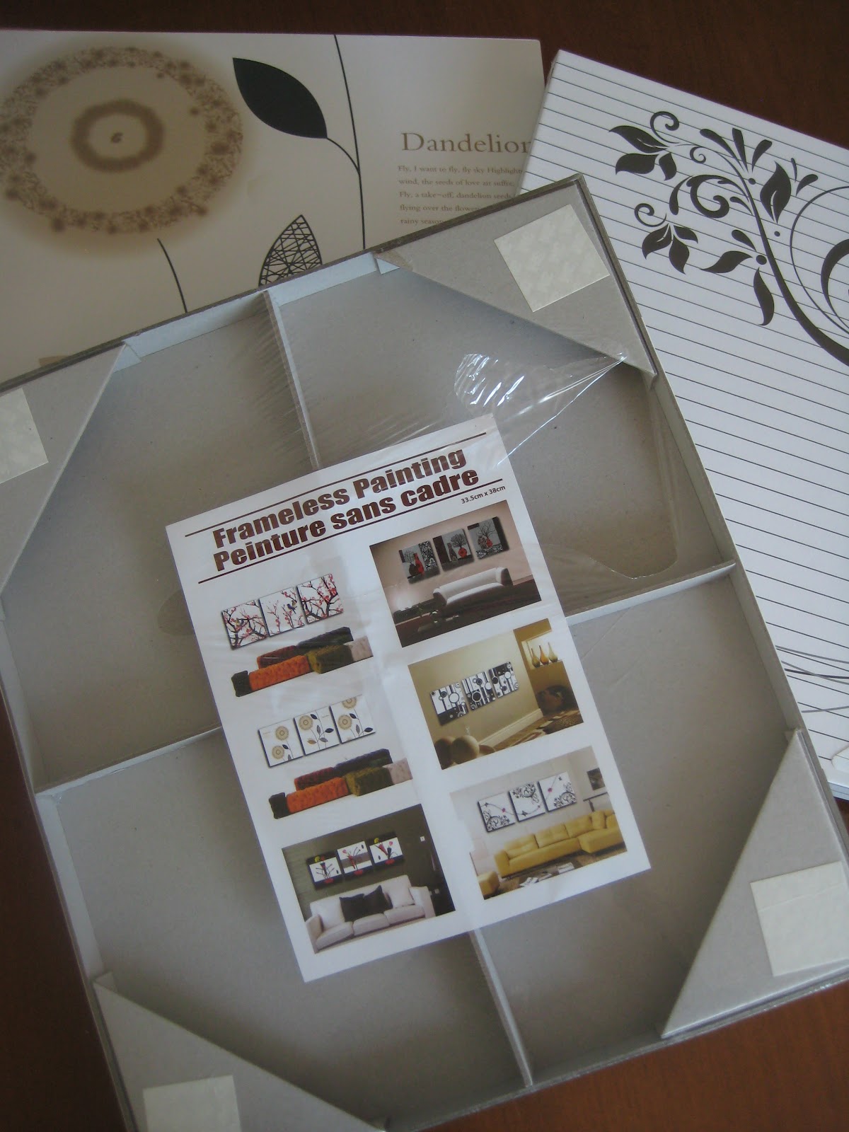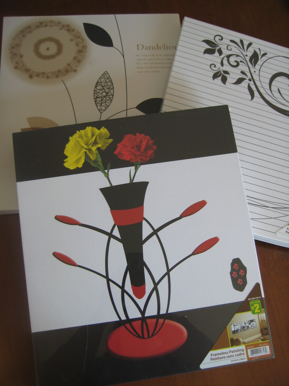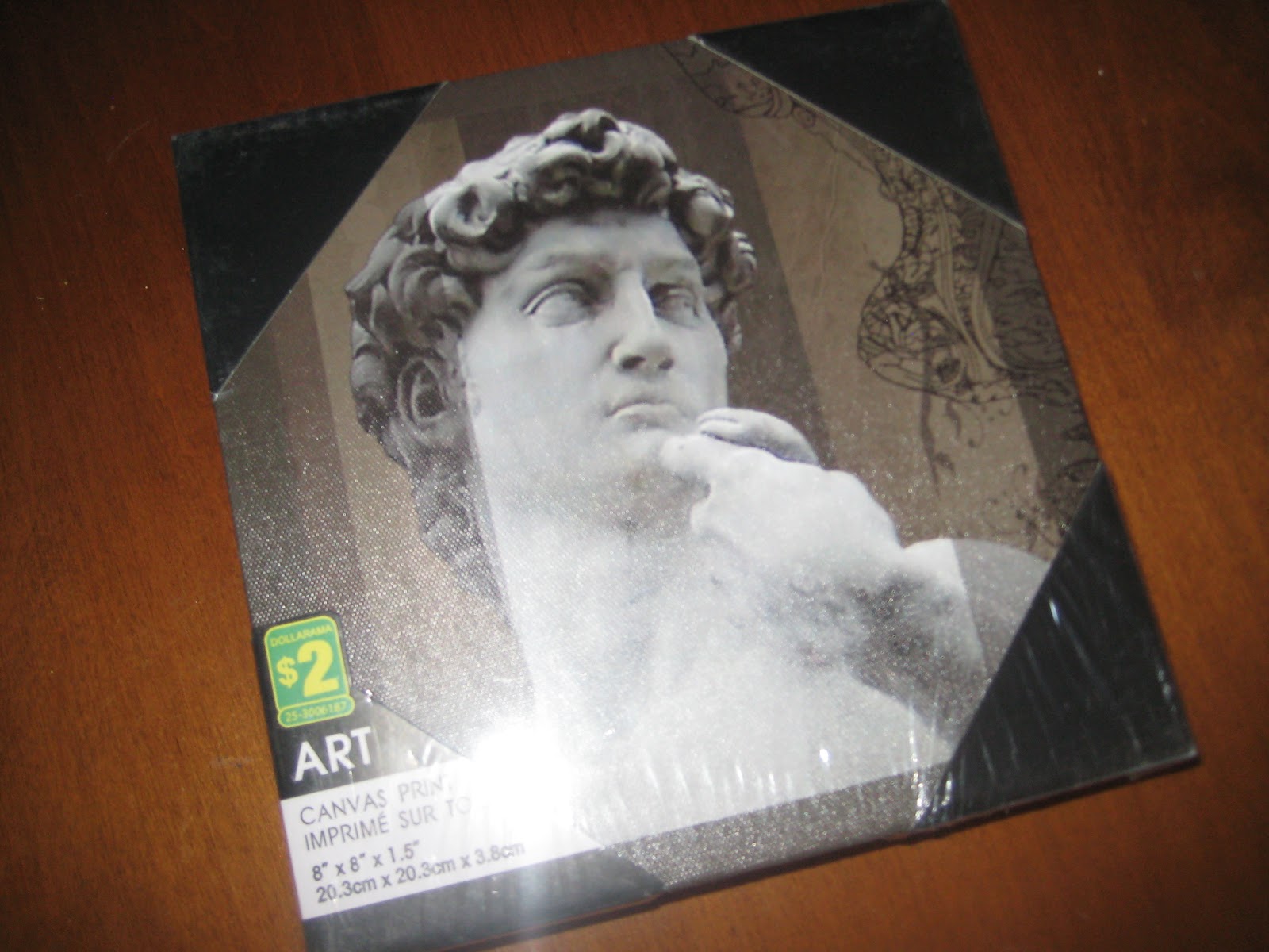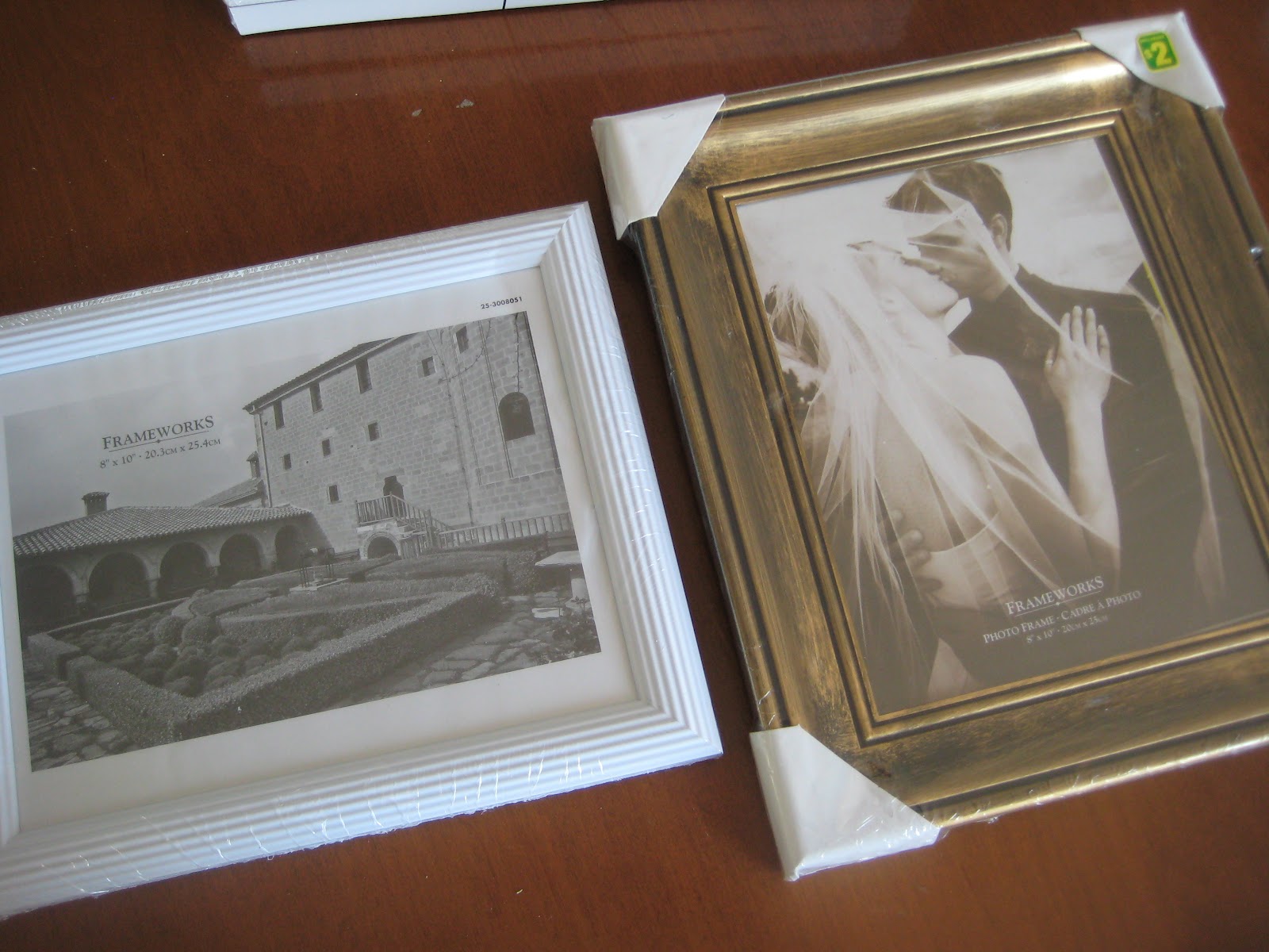 I went to the local dollar store and checked out the home decor aisle. I found a couple of “frameless paintings” (I guess that’s how the label chose to describe printed canvases?) as well as a few photo frames. The artwork and frames were just cheap gold-painted plastic, but I picked ones that had a nice size or texture — it’s “all in the bones,” as the designers say, right?