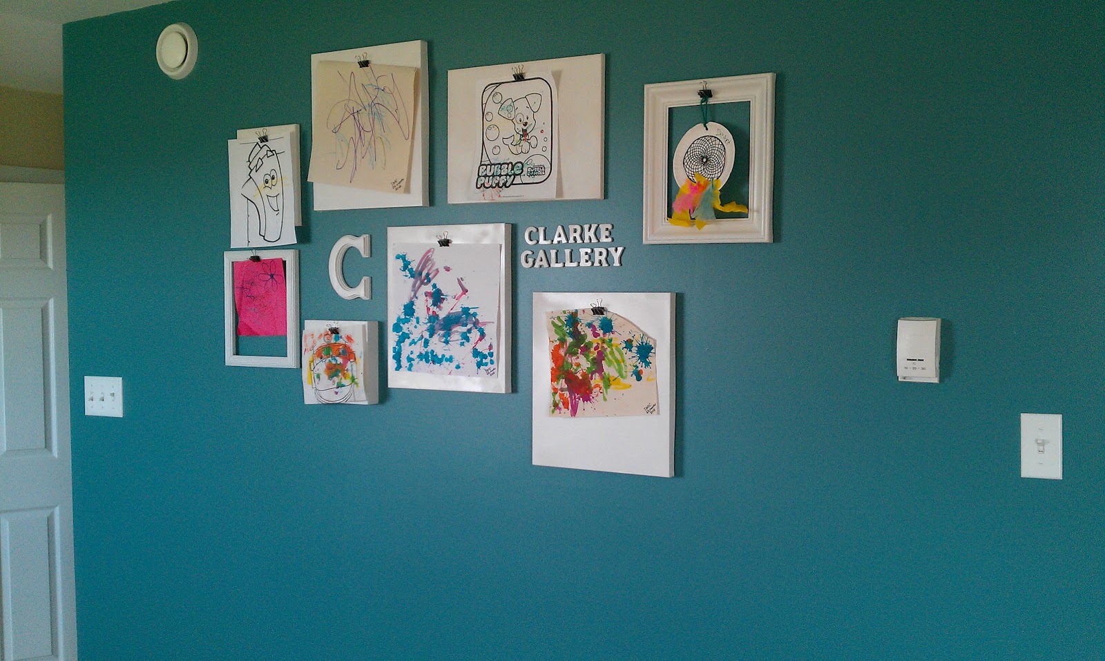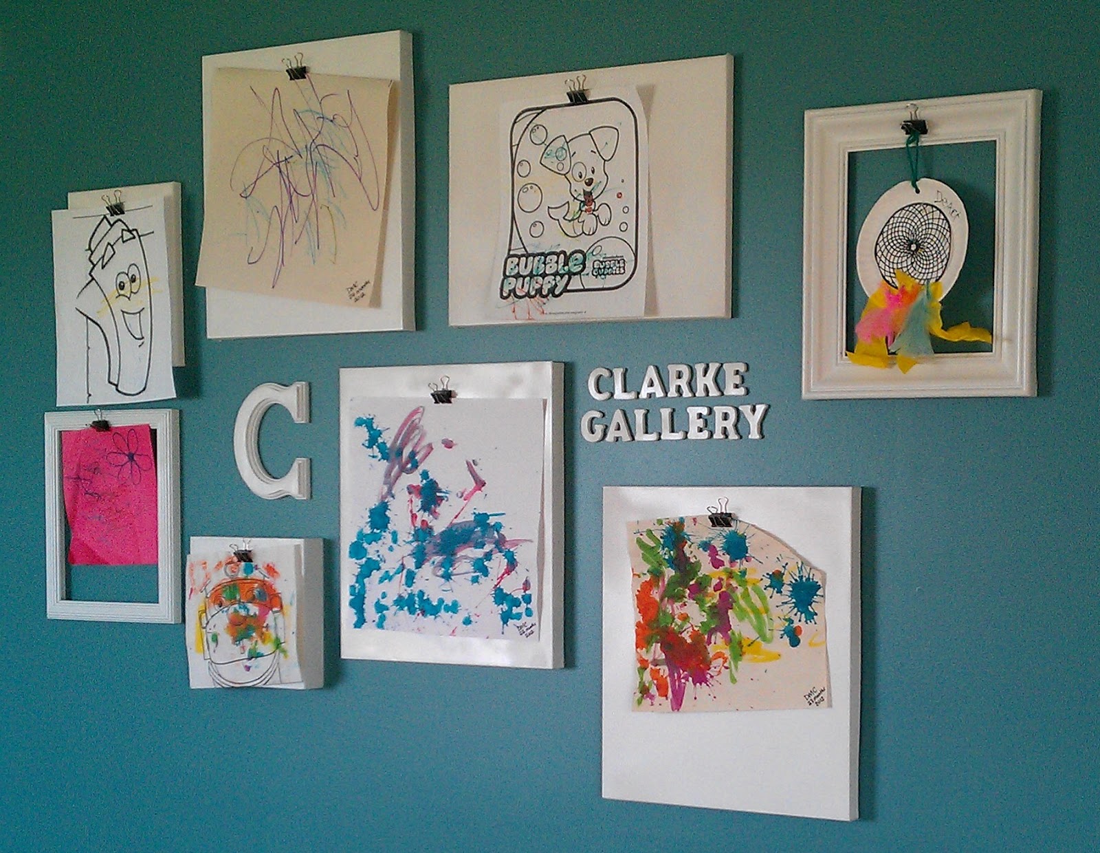 Our family gallery has been a bustling spot, as the kids constantly make new works of art to hang up. Dexter brings home at least two or three creations every time he goes to preschool, and he’s so proud to see his paintings and worksheets go up.