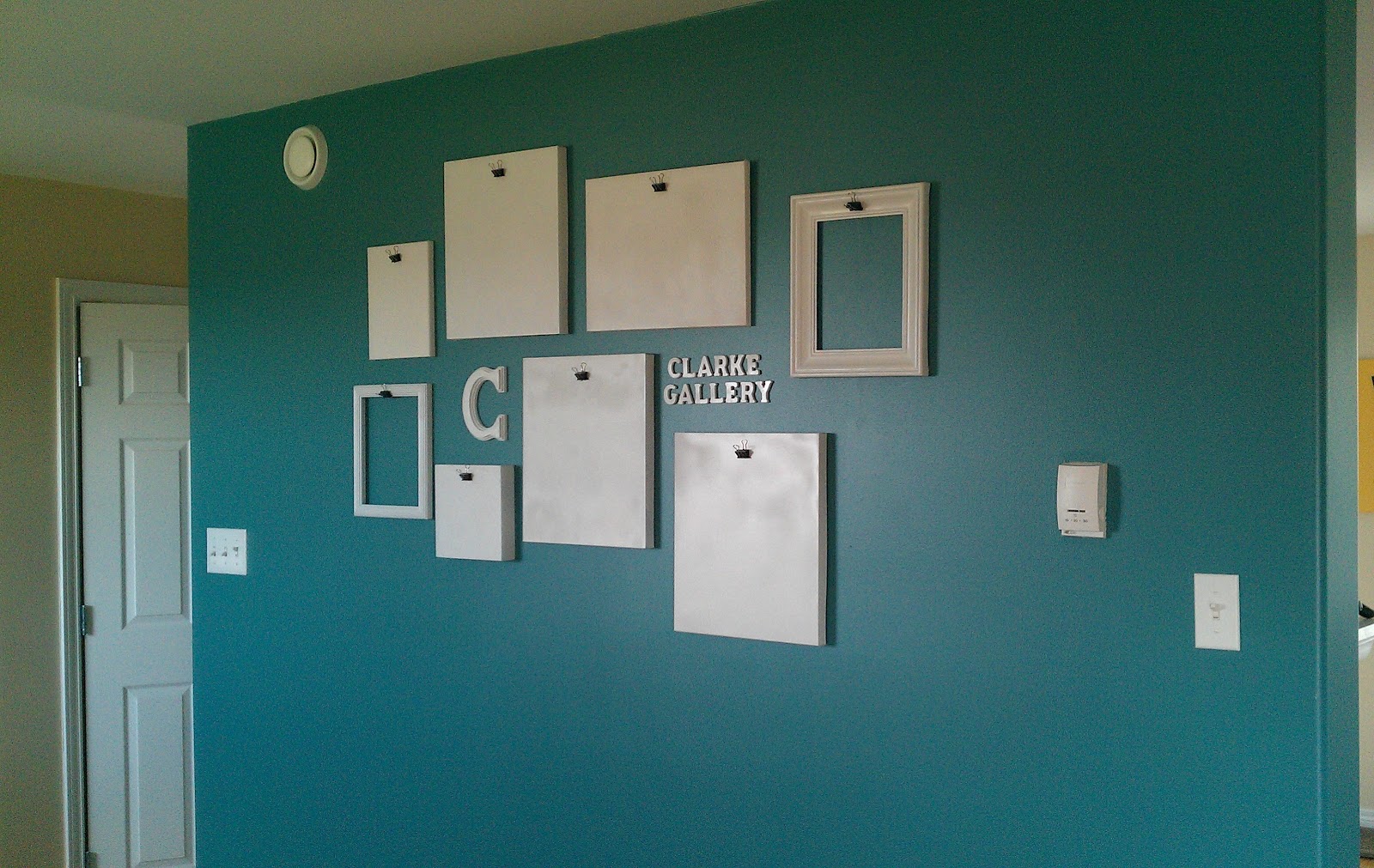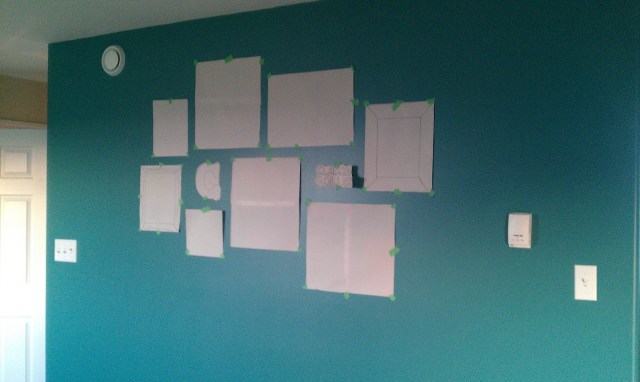 Once the binder clips were firmly glued on, I played around with the arrangement on the kitchen floor until I figured out how I wanted it to look. I had a good chunk of wall to fill, but everything had to stay sandwiched between the light switch and the thermostat.
