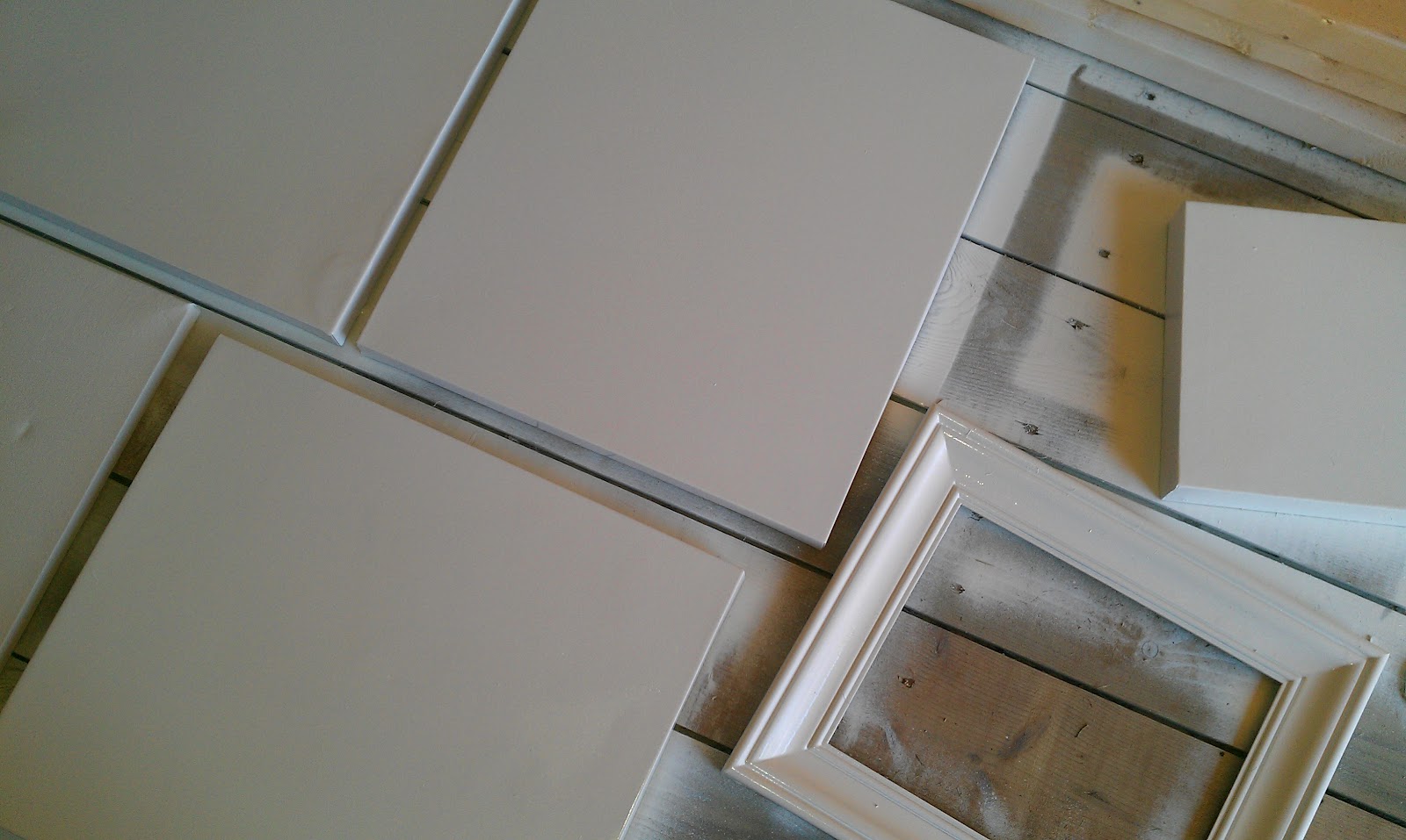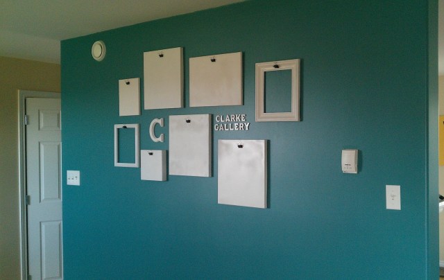 Once I brought everything home, I took the frames and canvases out to the shed and gave them a few coats of white spray paint. I also spray-painted a wooden “C” and some letters that spelled “CLARKE GALLERY” that I’d purchased at Michaels, because I’m obsessed with putting our family’s name/initial in as many places as possible.(It should be noted that I am the world’s worst spray-painter, because I get overzealous and can’t seem to remember the whole “several thin coats” philosophy. I happily spray and spray until the can is empty. Luckily, for a project like this, it didn’t matter.)
