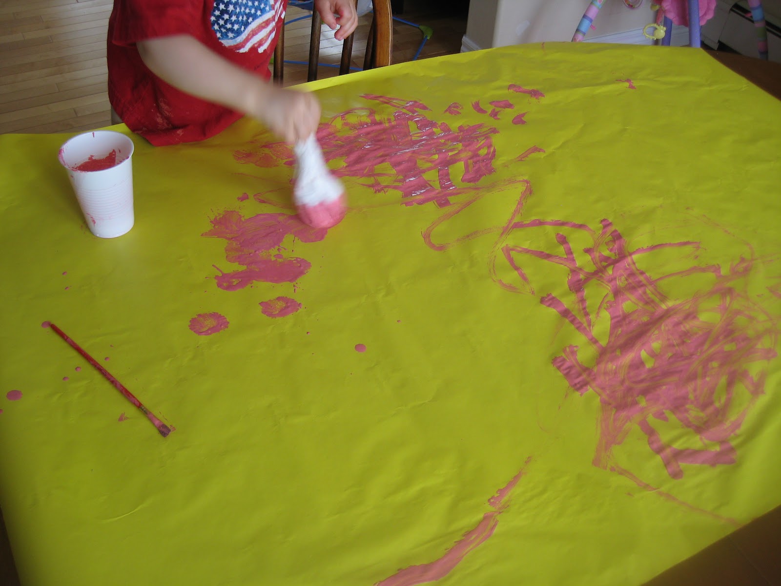 One word of caution: Don’t put a lot of paint in the cup, because at some point they WILL purposely pour the cup of paint all over the paper. Every. Single. Time. Just put enough so that when they do pour it, it’s not going to flood the paper and go everywhere. Lesson, uh, learned.