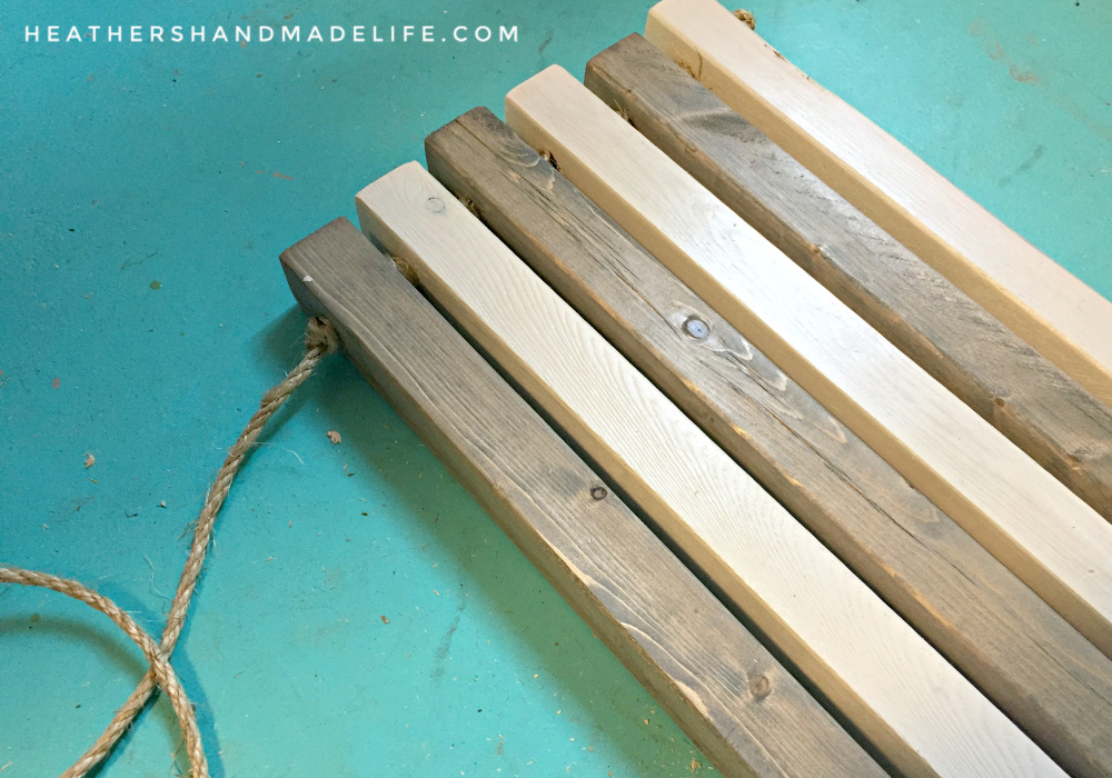 It was super fast — and oddly satisfying — stringing the planks onto the rope, and tying knots between each one. Oh, and if you’re having trouble jamming the rope through the holes, wrap a piece of scotch tape around the tip to help thread it through.