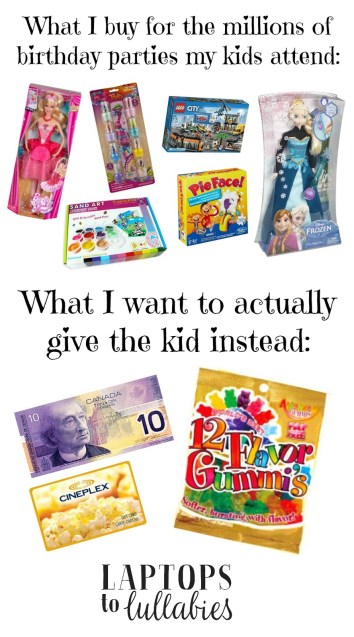 I think sometimes about giving movie money or a gift certificate for a store, but my kids would think it’s a “boring” thing to give to their friend. It lacks the excitement of opening a shiny new toy.